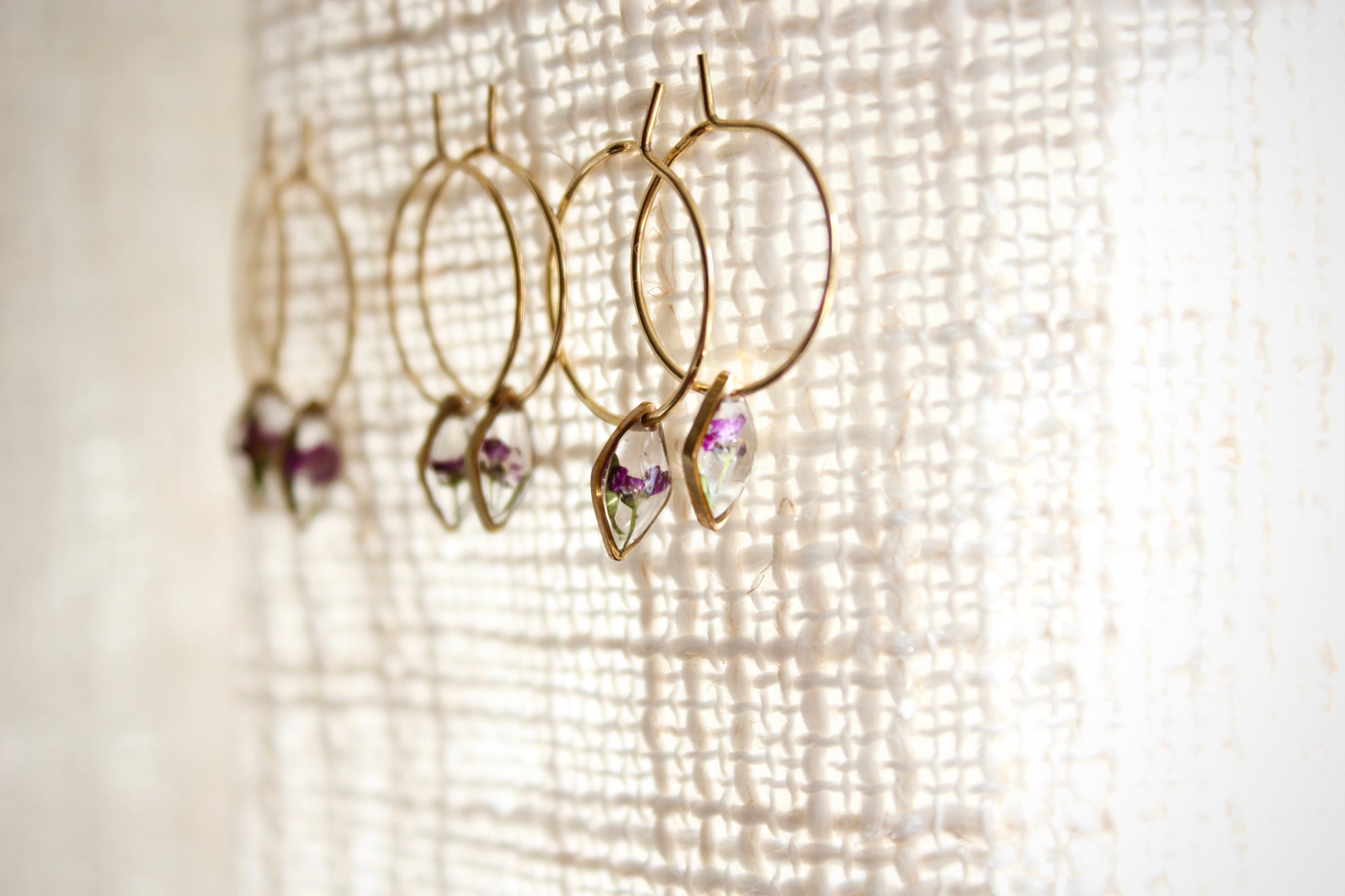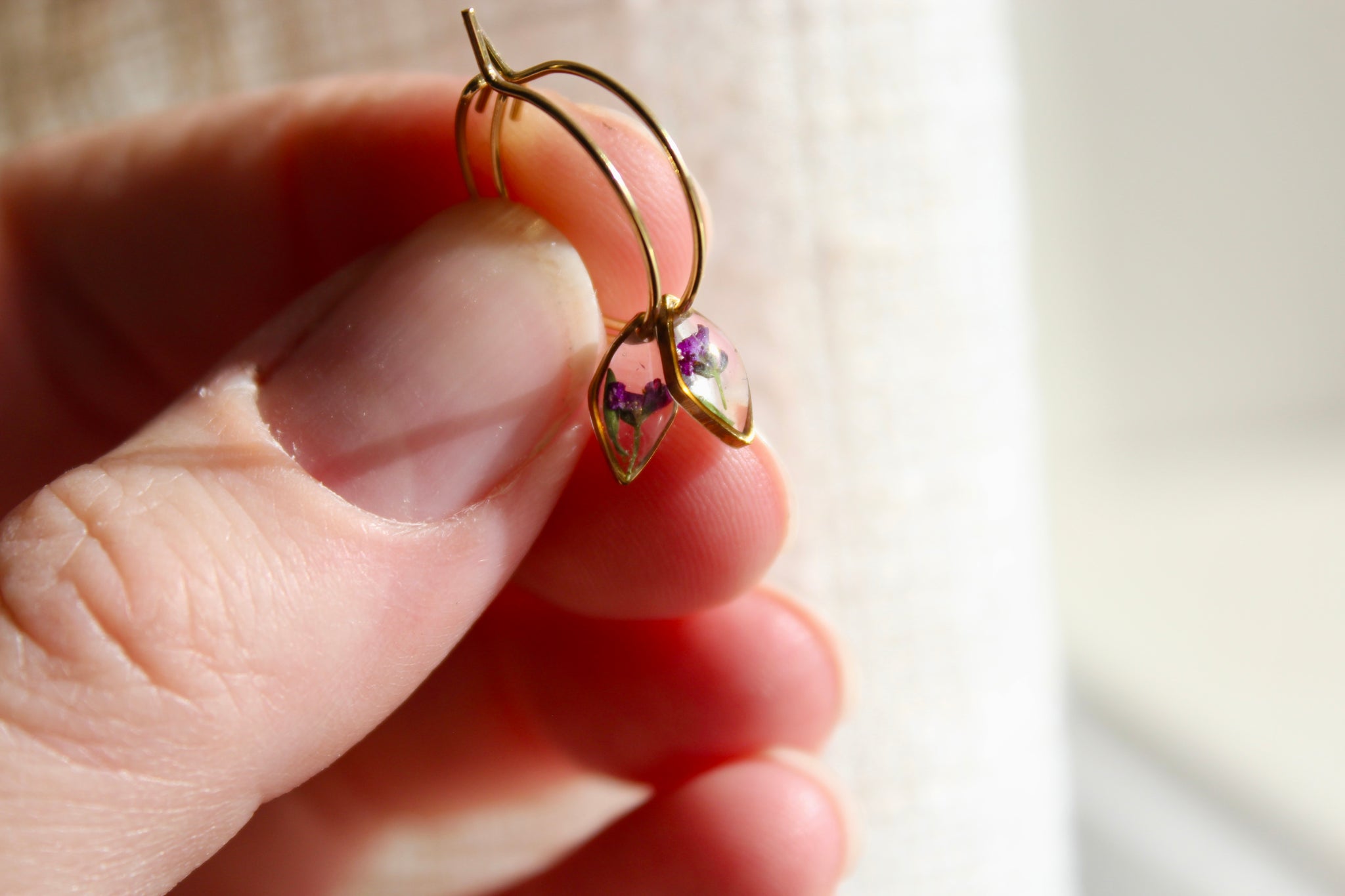 Handmade one at a time from my home studio in Alberta with real Alyssum flowers. Inspired by the simplicity and symmetry of nature. You won't believe how small these are! They are super dainty, lightweight sleeper hoops and perfect for everyday wear.
