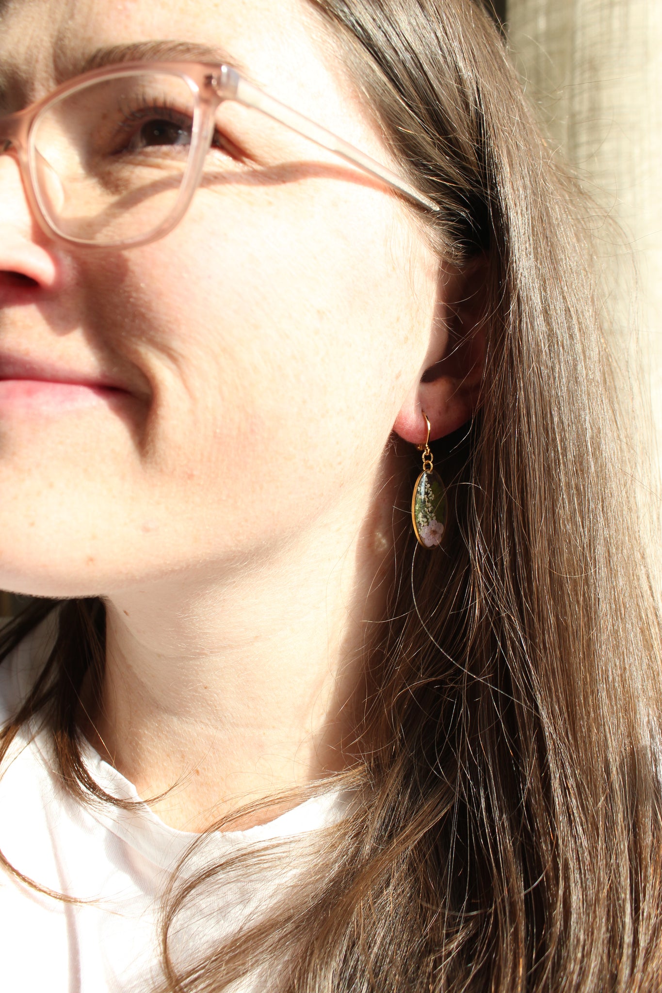 Materials used: resin, brass frames (gold colour), hypoallergenic gold plated stainless steel huggies.