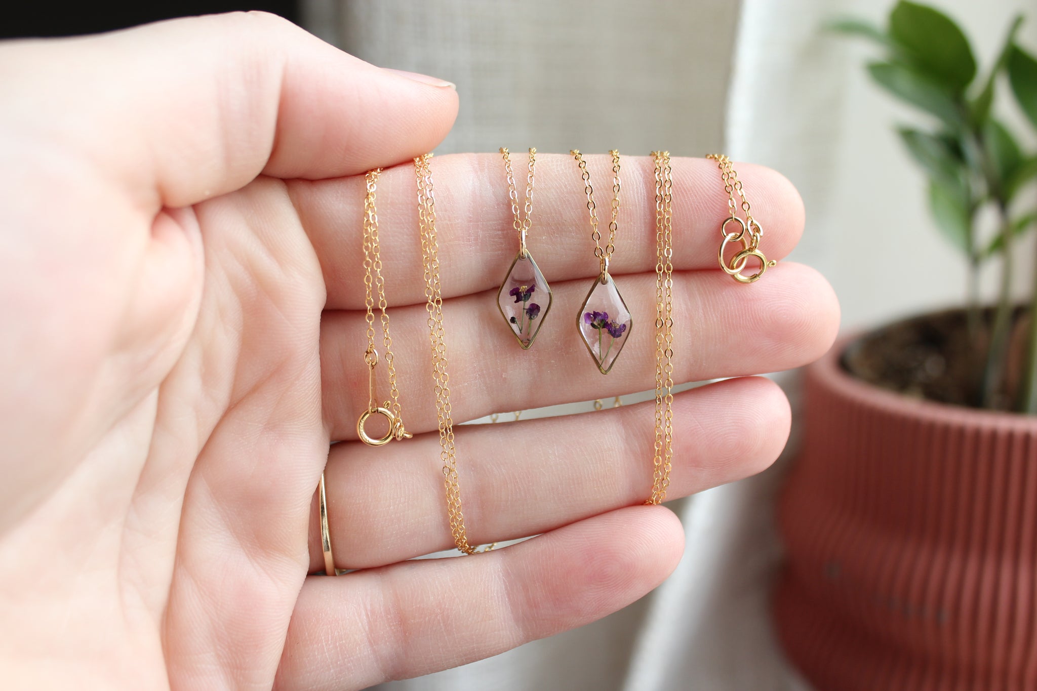 Handmade one at a time from my home studio in Alberta with tiny alyssum flowers grown from my own garden. Inspired by the simplicity of nature. This necklace is super lightweight, perfect for everyday wear and the pop of colour adds an element of nature to any outfit.