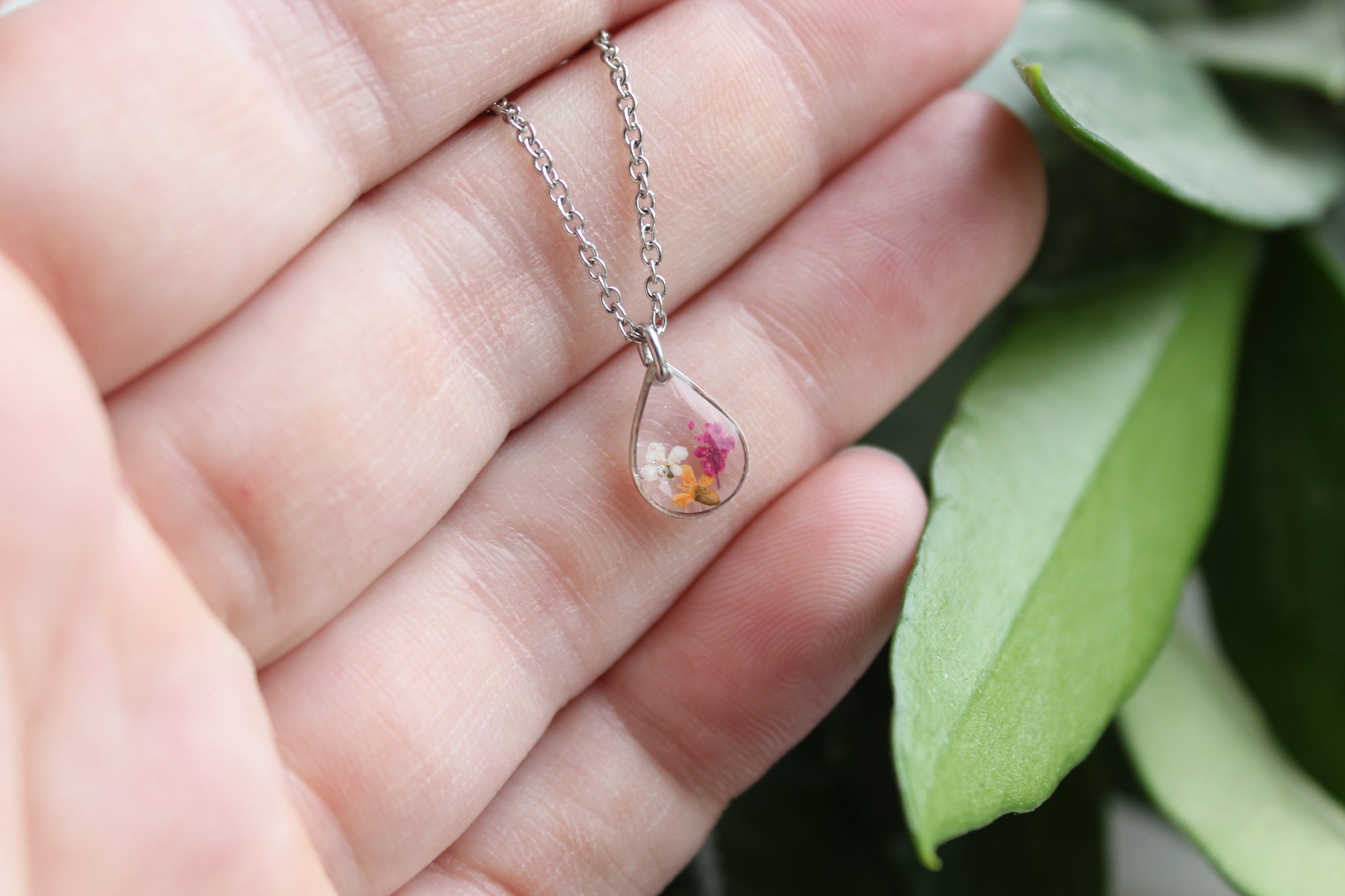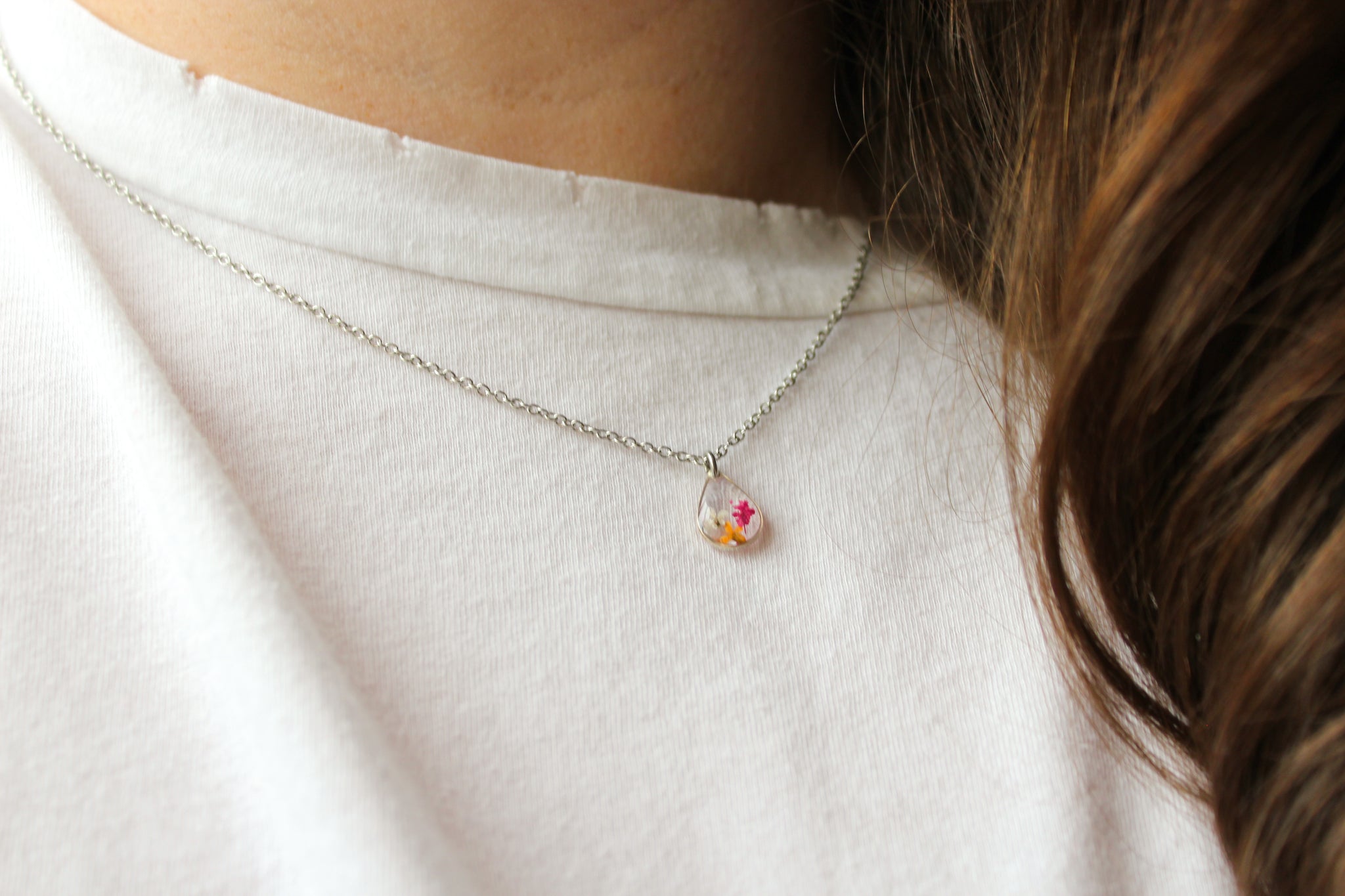 Handmade one at a time from my home studio in Alberta with real queen anne's lace flowers. Inspired by the simplicity of nature. This necklace is super lightweight, perfect for everyday wear and the tiny colourful flowers add an element of interest to any outfit.