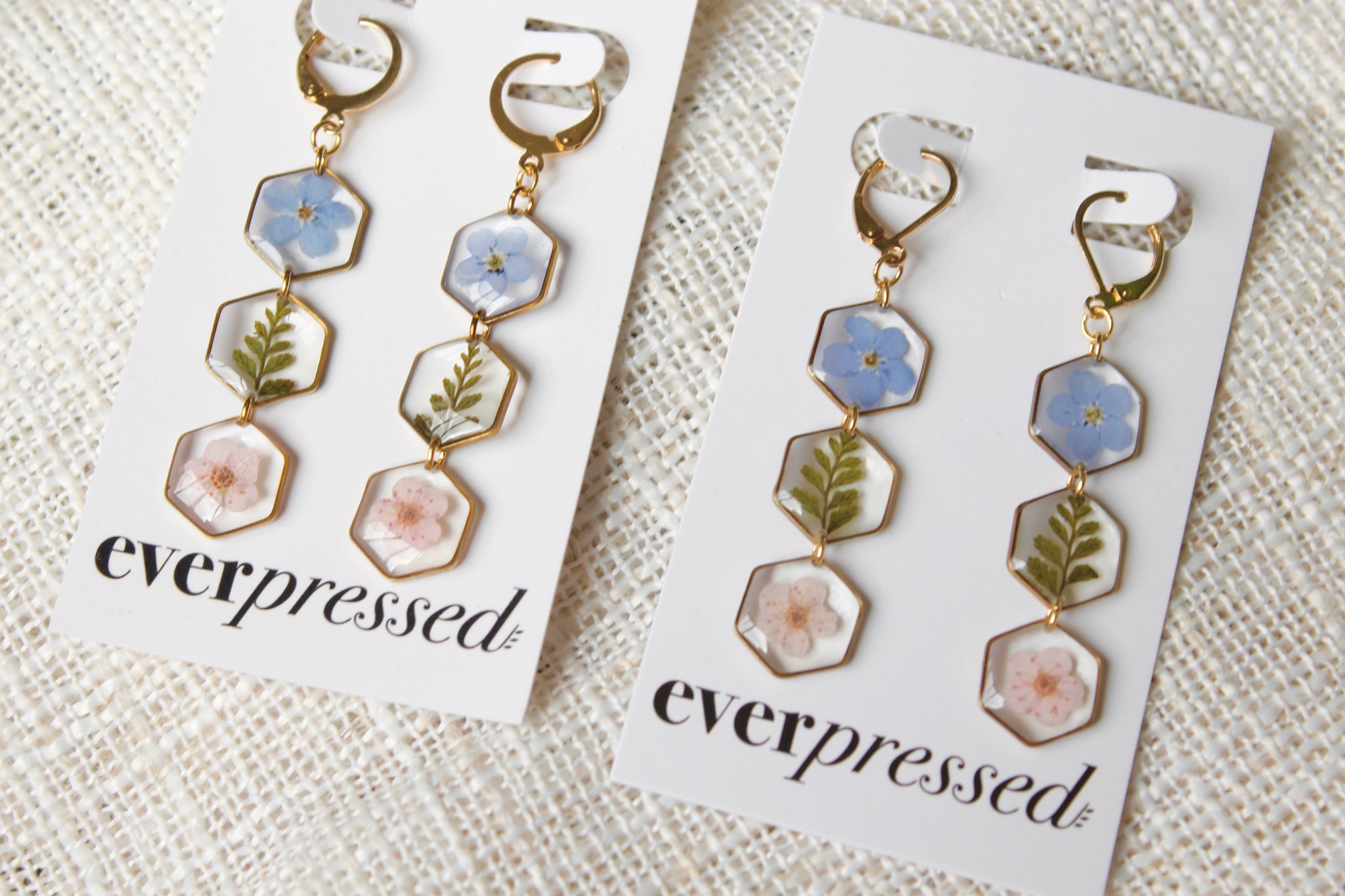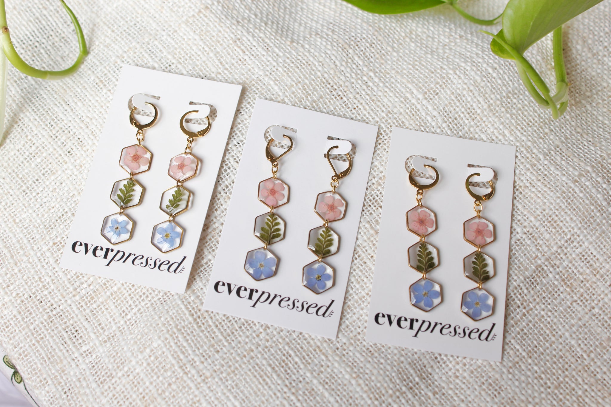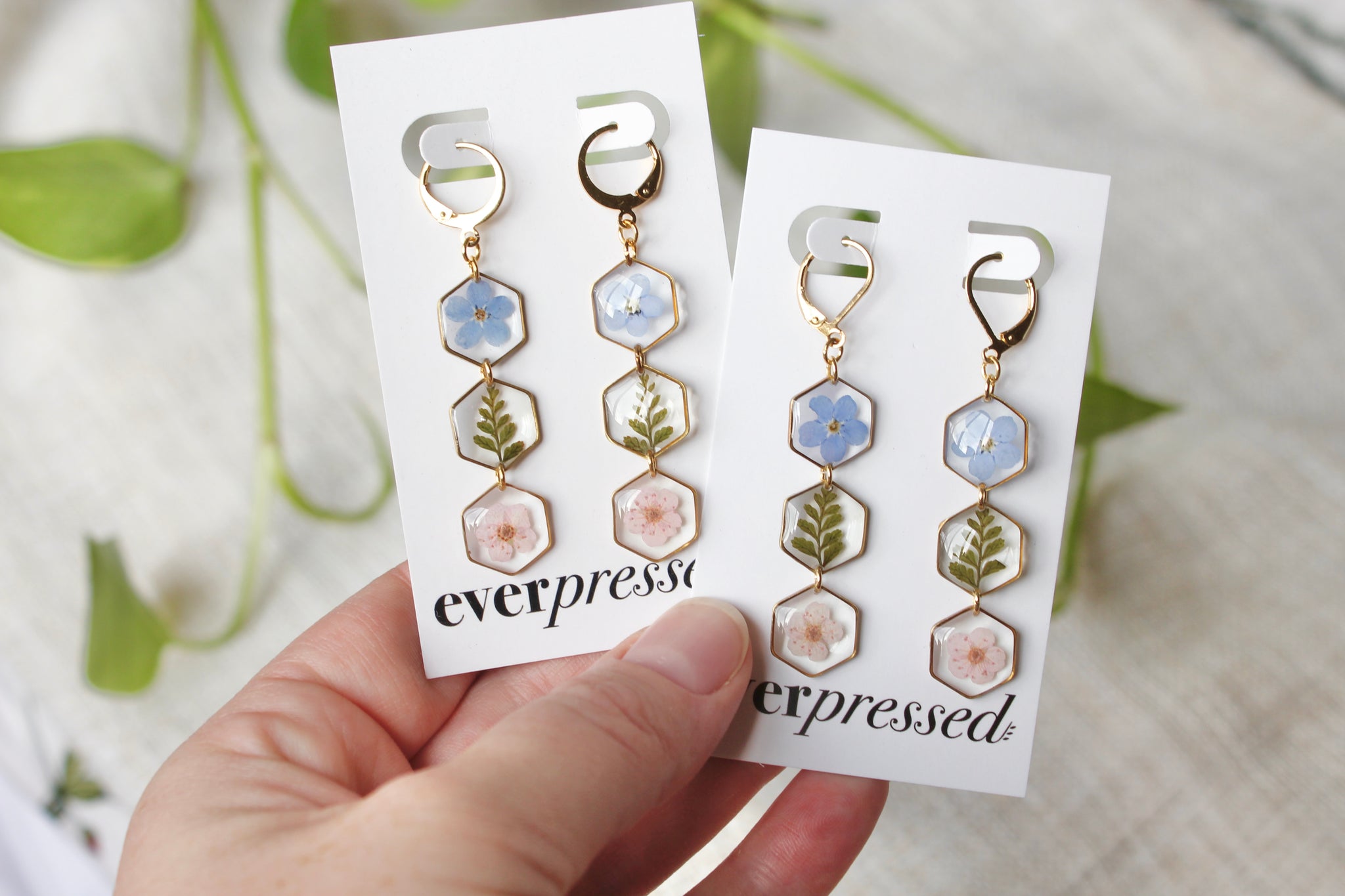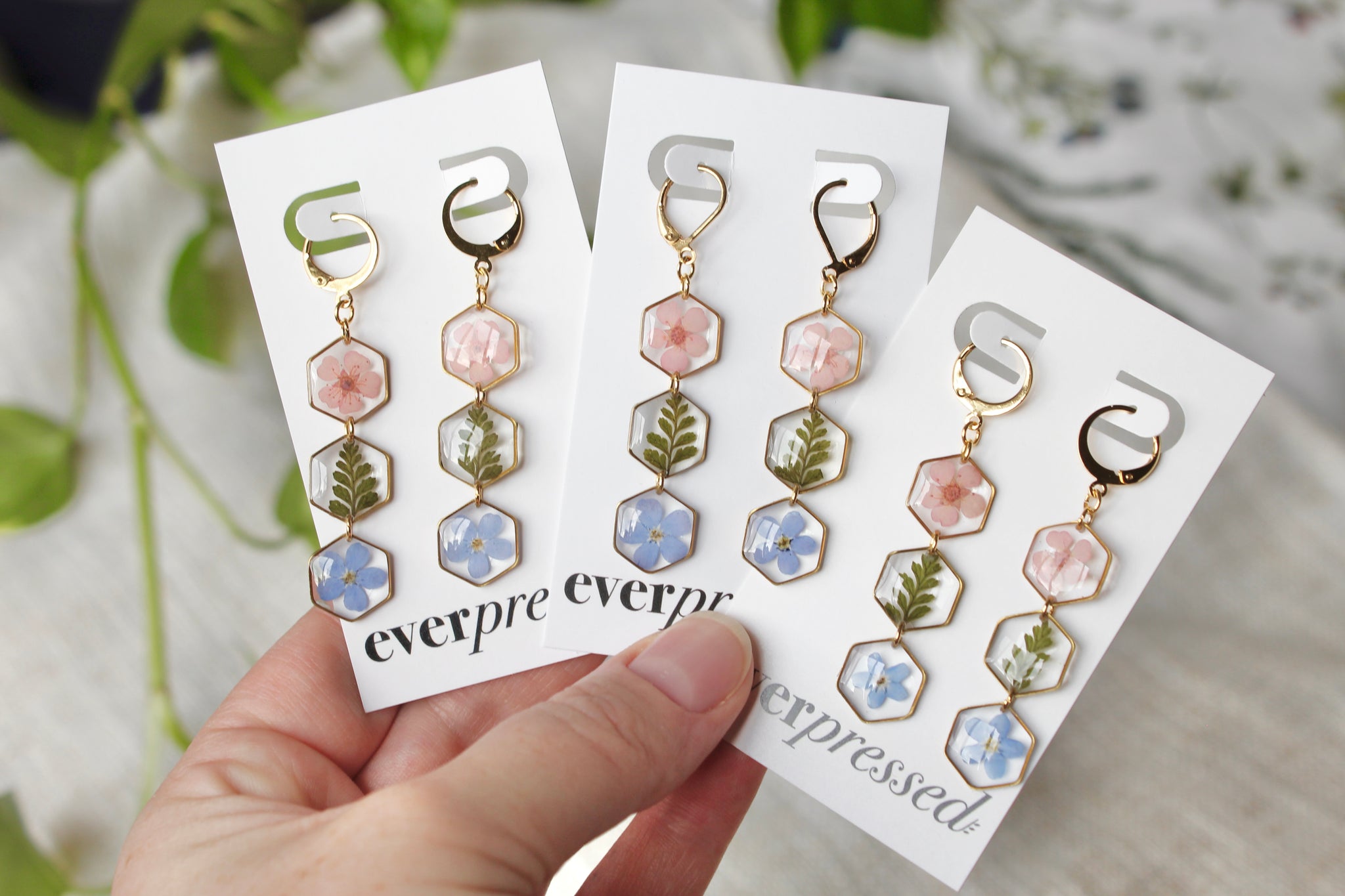 Handmade one at a time from my home studio in Alberta with real narcissus, fern and forget me not flowers. Inspired by the simplicity and symmetry of nature. Lightweight and perfect for everyday wear.