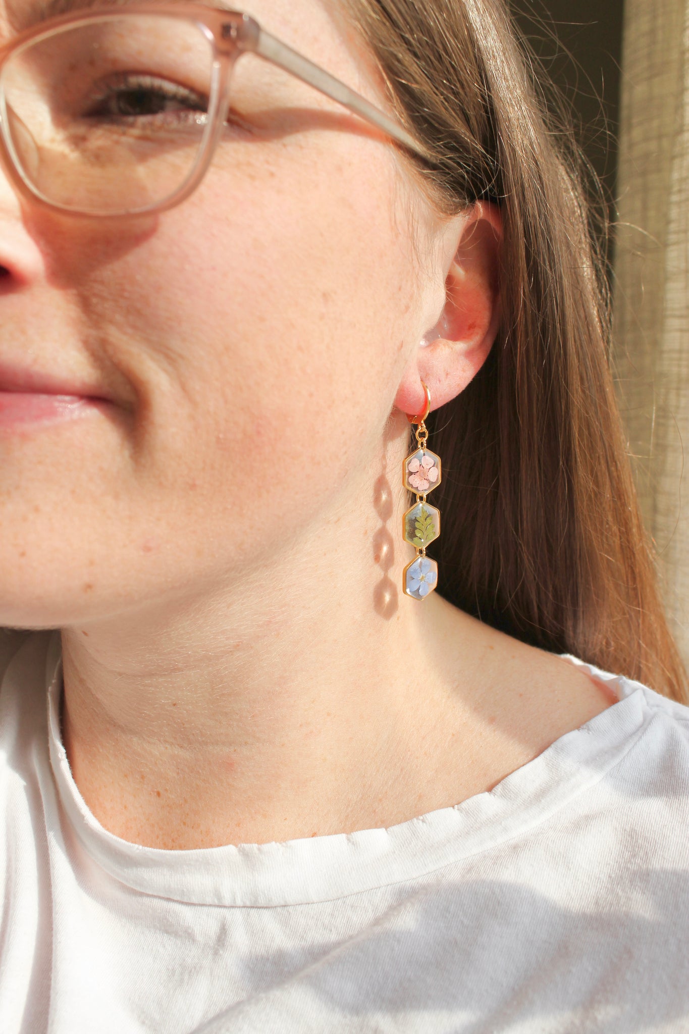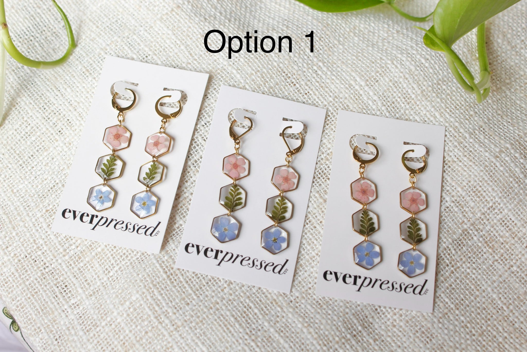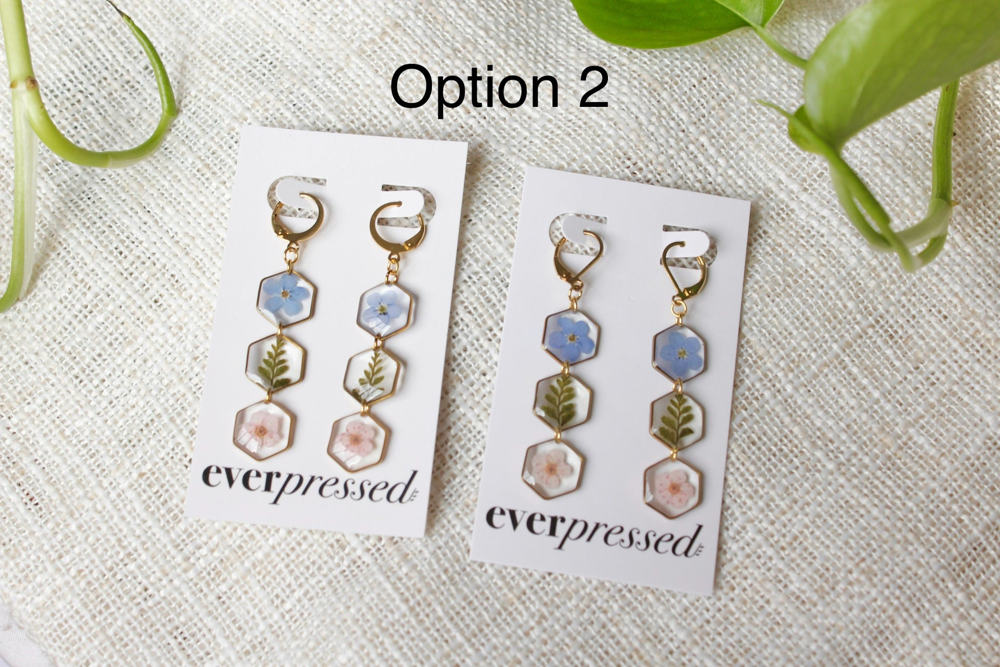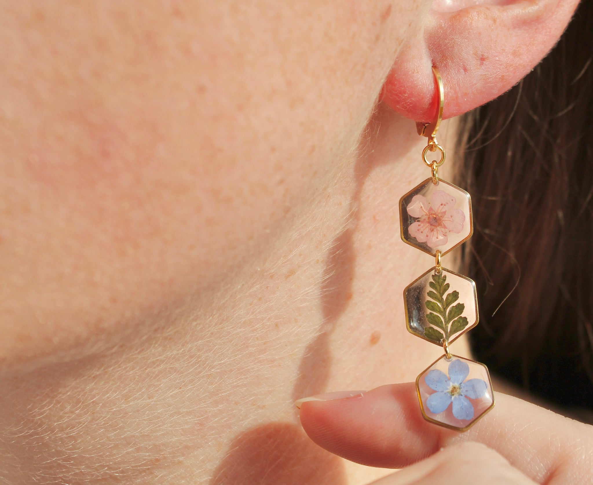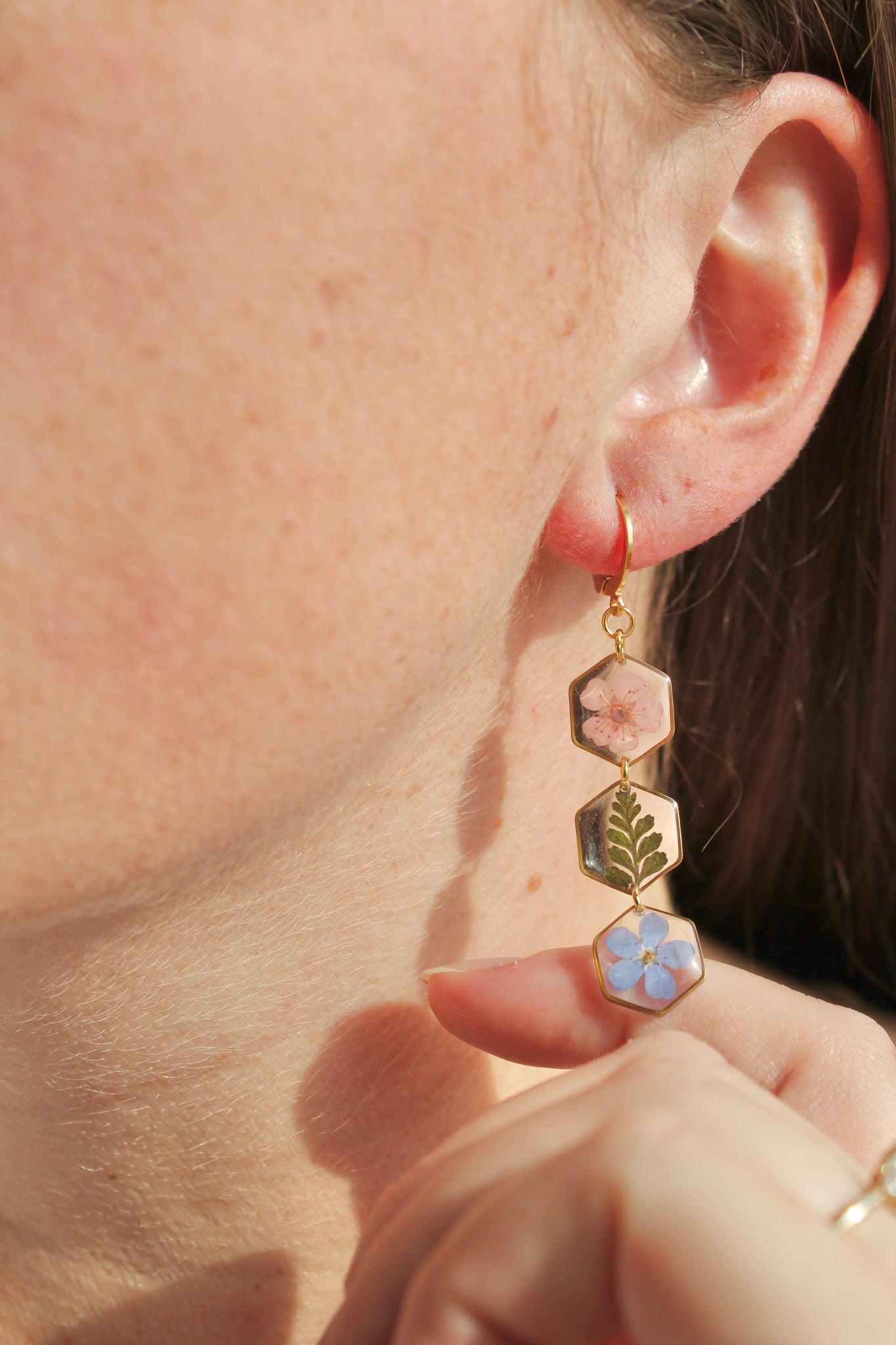 Handmade one at a time from my home studio in Alberta with real narcissus, fern and forget me not flowers. Inspired by the simplicity and symmetry of nature. Lightweight and perfect for everyday wear.