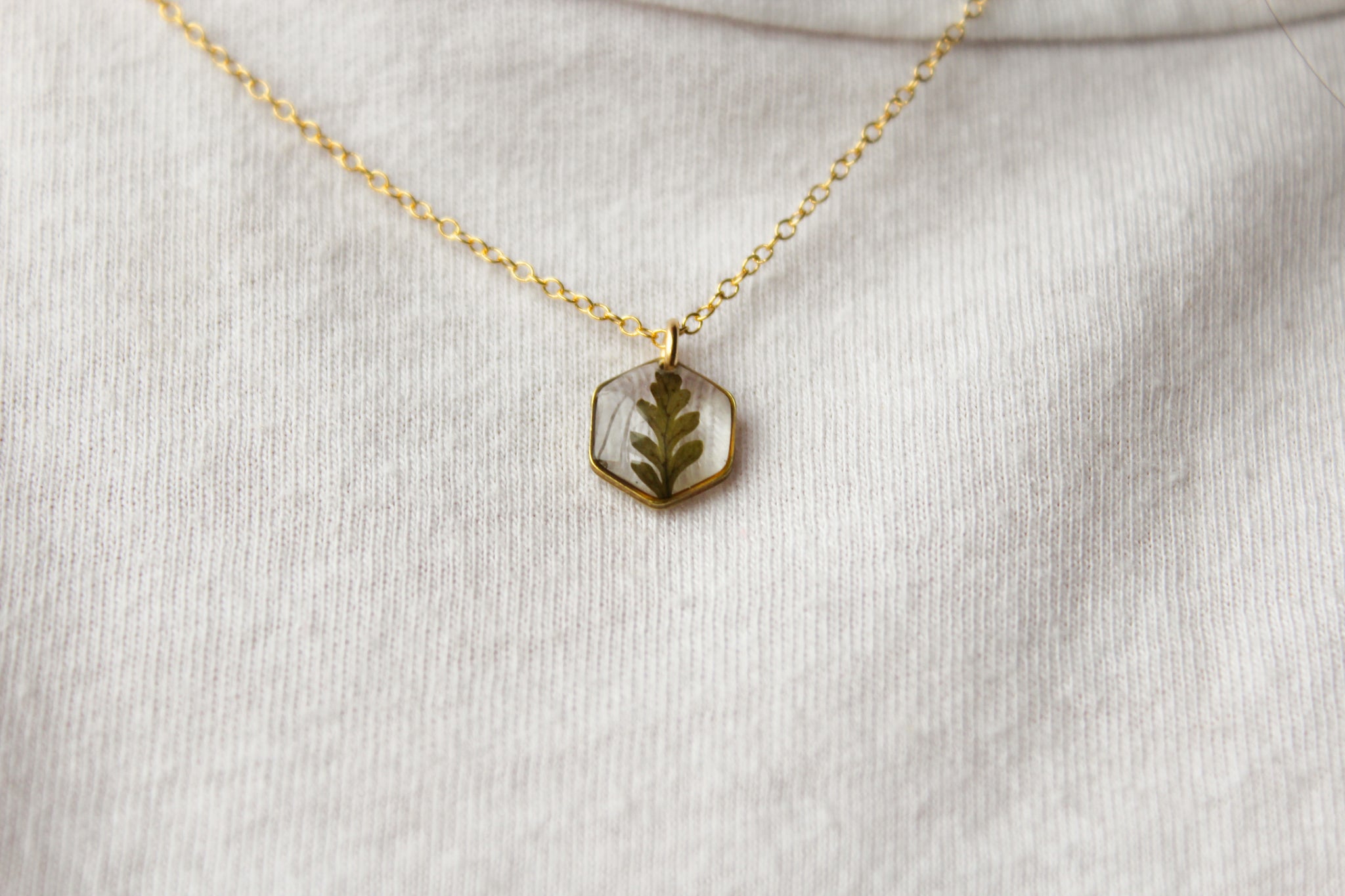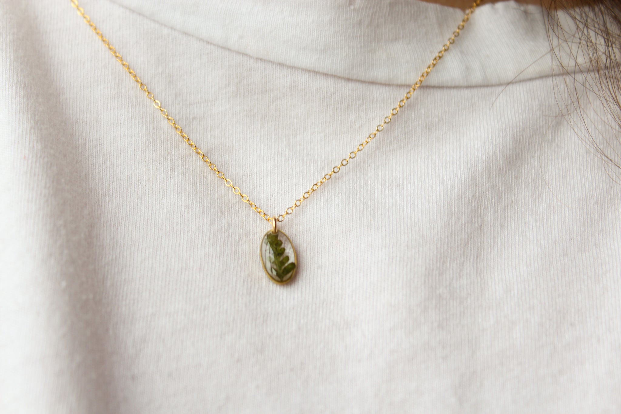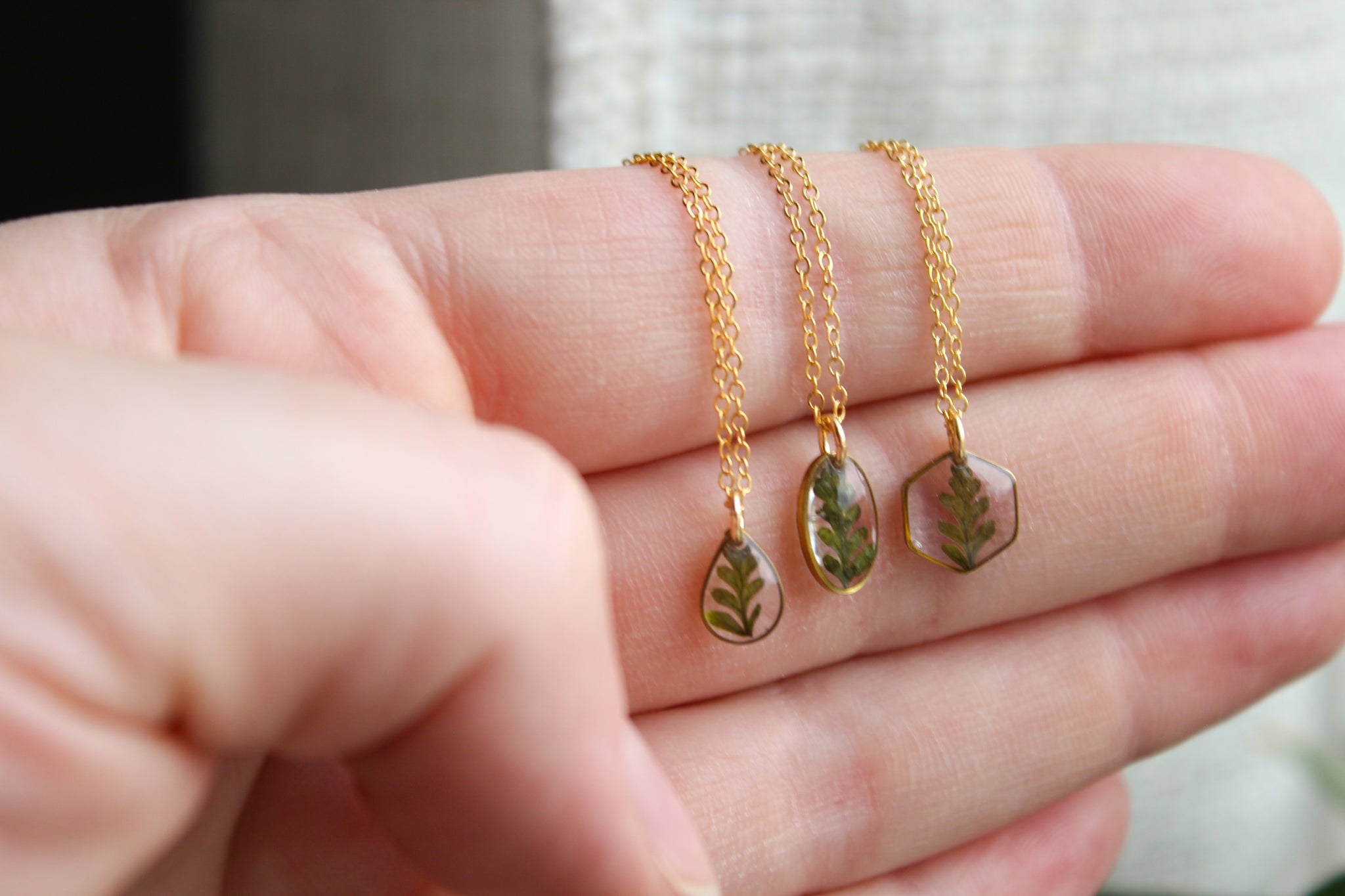 Handmade one at a time from my home studio in Alberta with tiny fern leaves. Inspired by the simplicity of nature. This necklace is super lightweight, perfect for everyday wear and the dainty leaf add an element of the outdoors to any outfit.