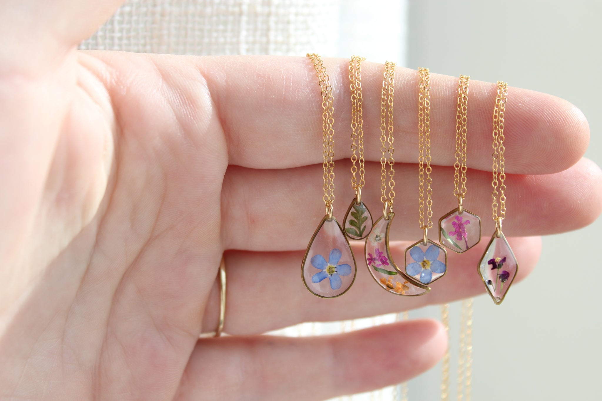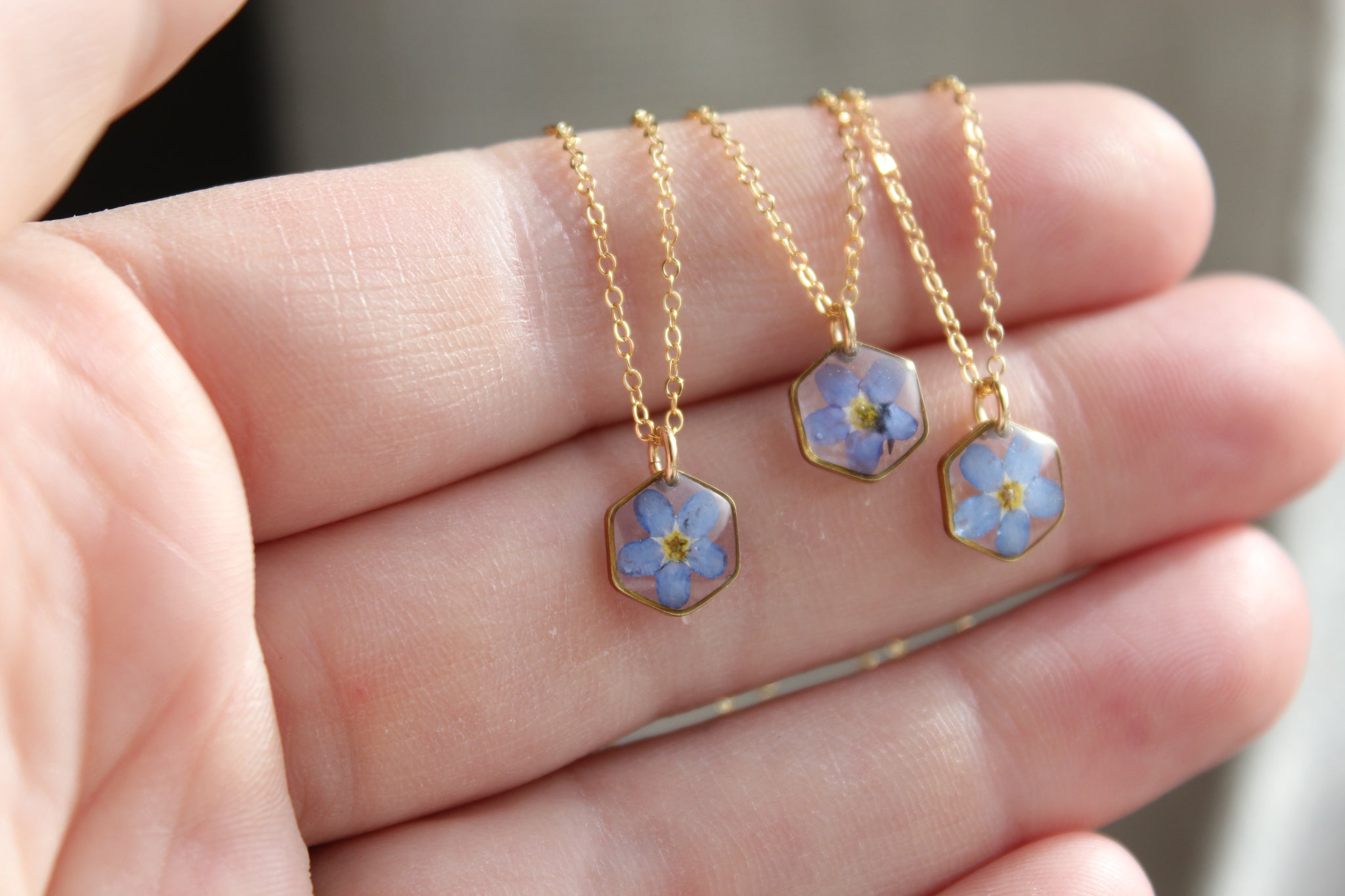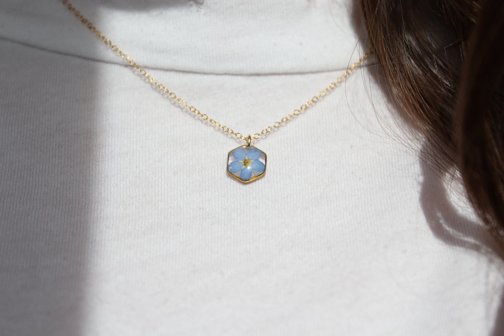 Handmade one at a time from my home studio in Alberta with real bright blue forget me not flowers. Inspired by the simplicity of nature. This necklace is super lightweight, perfect for everyday wear and the pop of blue adds an element of the outdoors to any outfit.