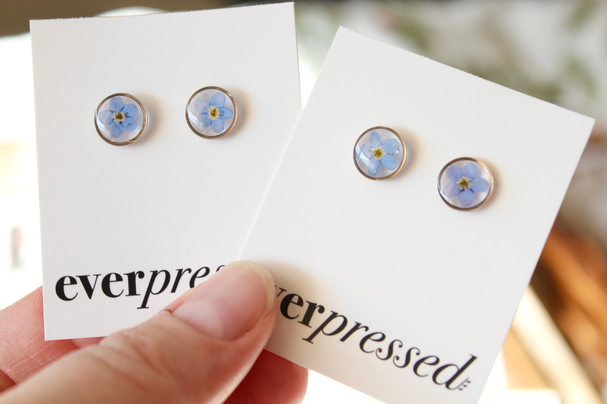 Handmade one at a time from my home studio in Alberta with real forget me not flowers. Inspired by the simplicity and symmetry of nature. Lightweight and perfect for everyday wear.
