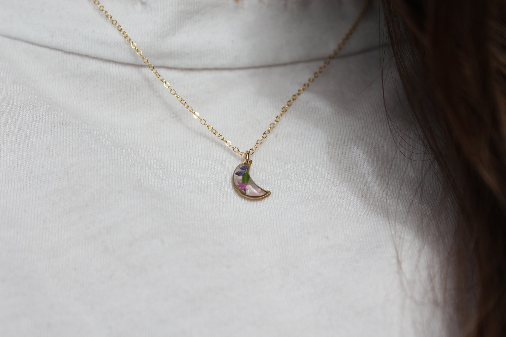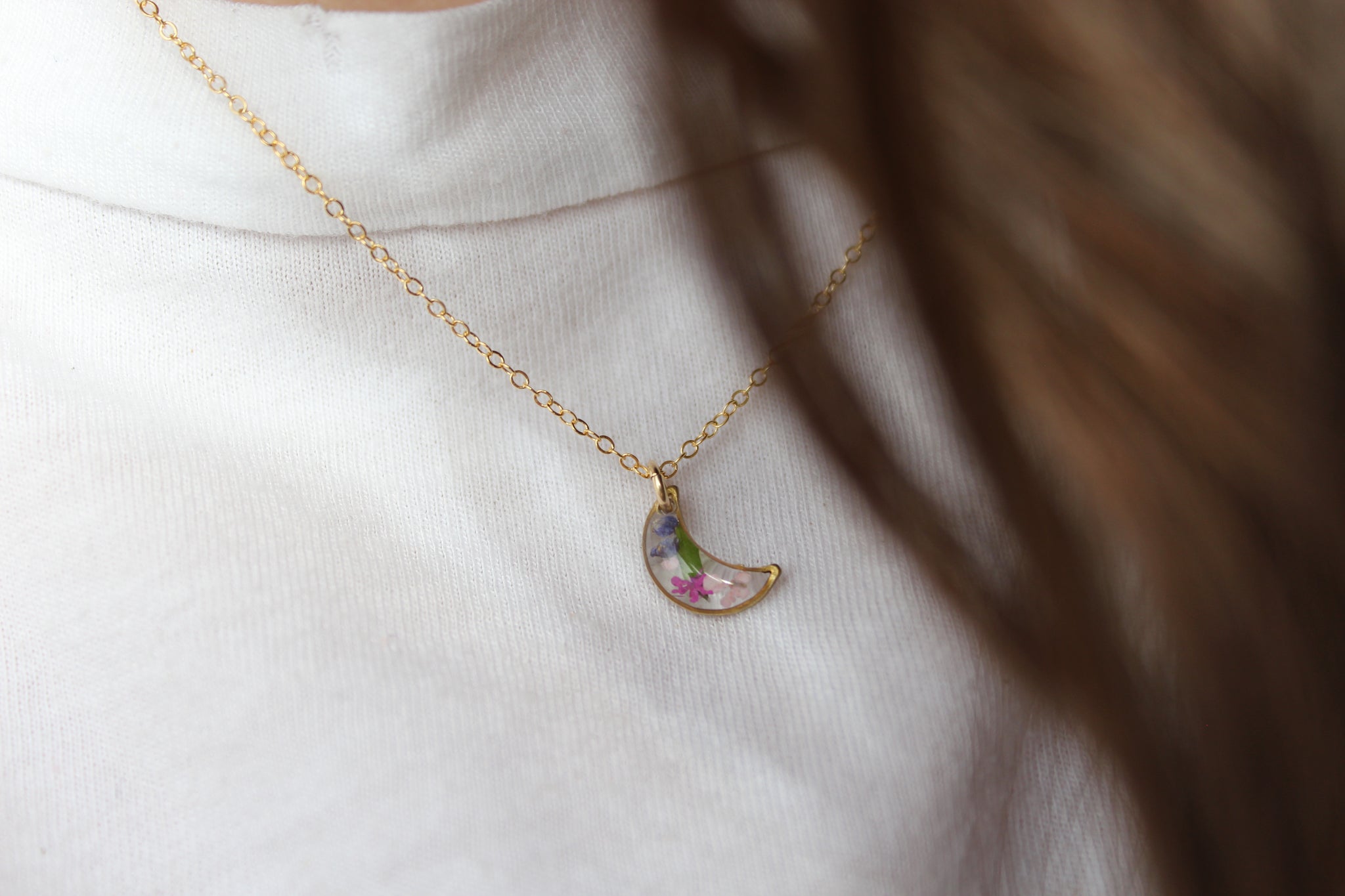 Handmade one at a time from my home studio in Alberta with real queen anne's lace flowers. Inspired by the simplicity of nature. This necklace is super lightweight, perfect for everyday wear and the pop of colour adds an element of nature to any outfit.