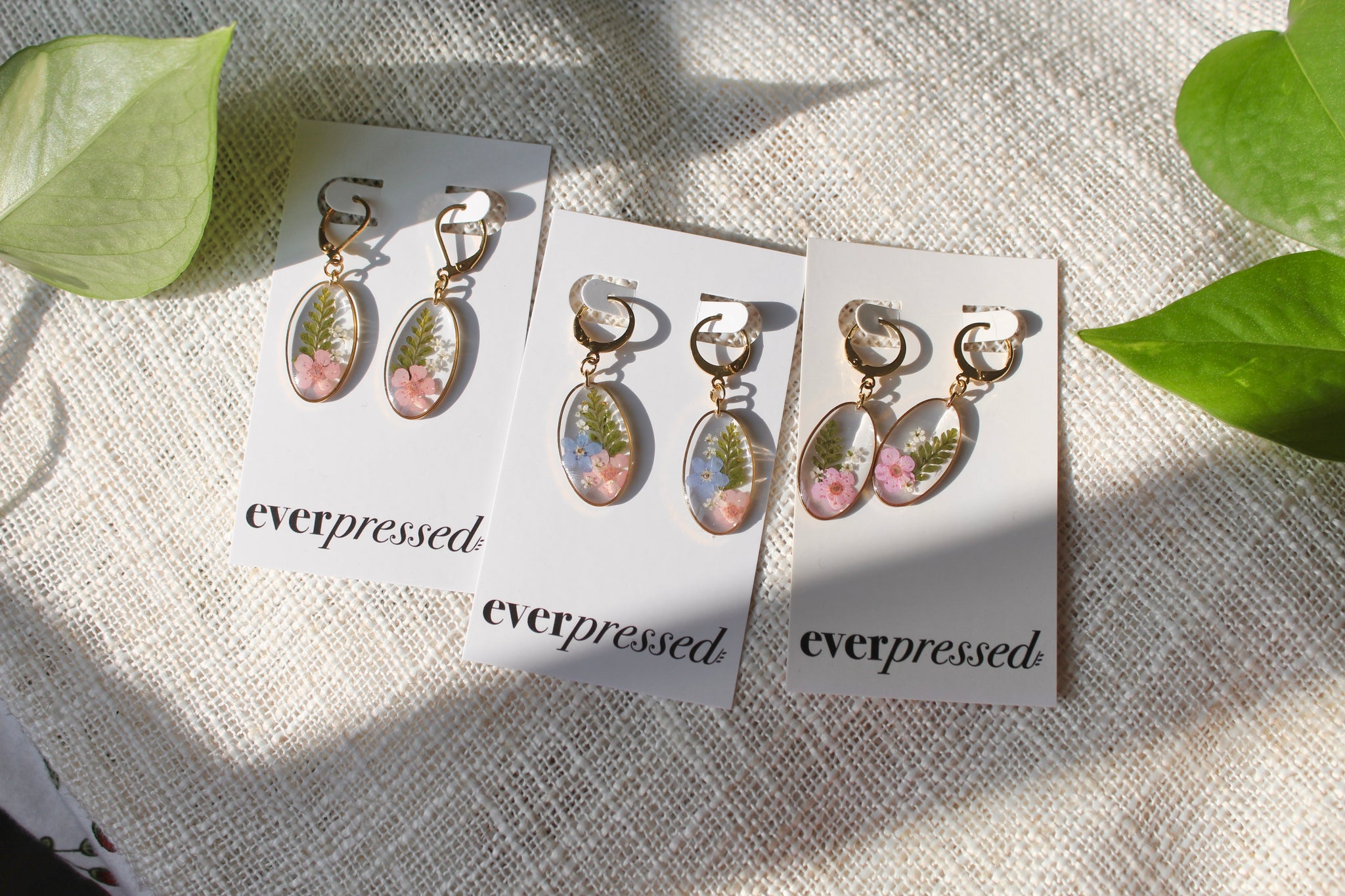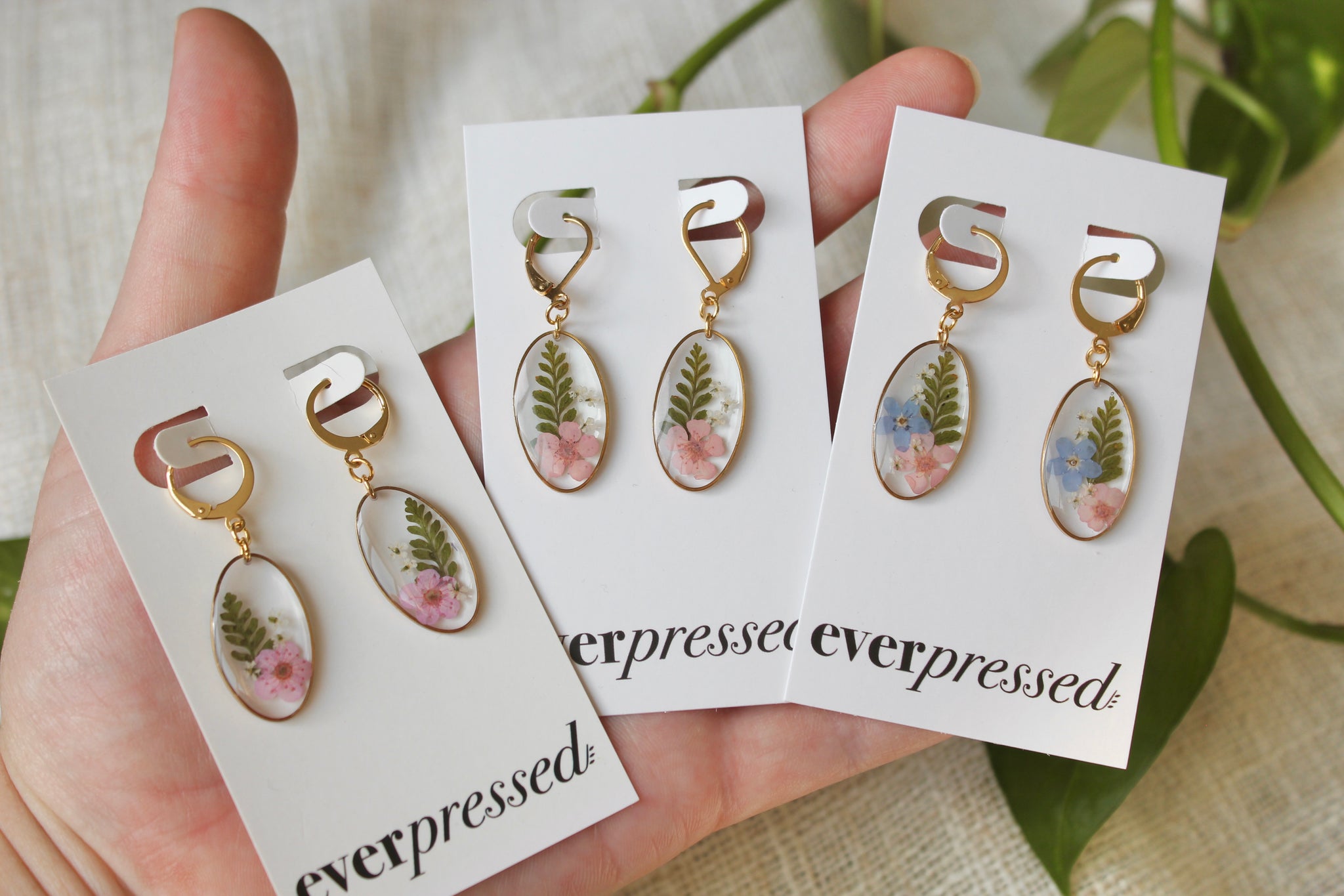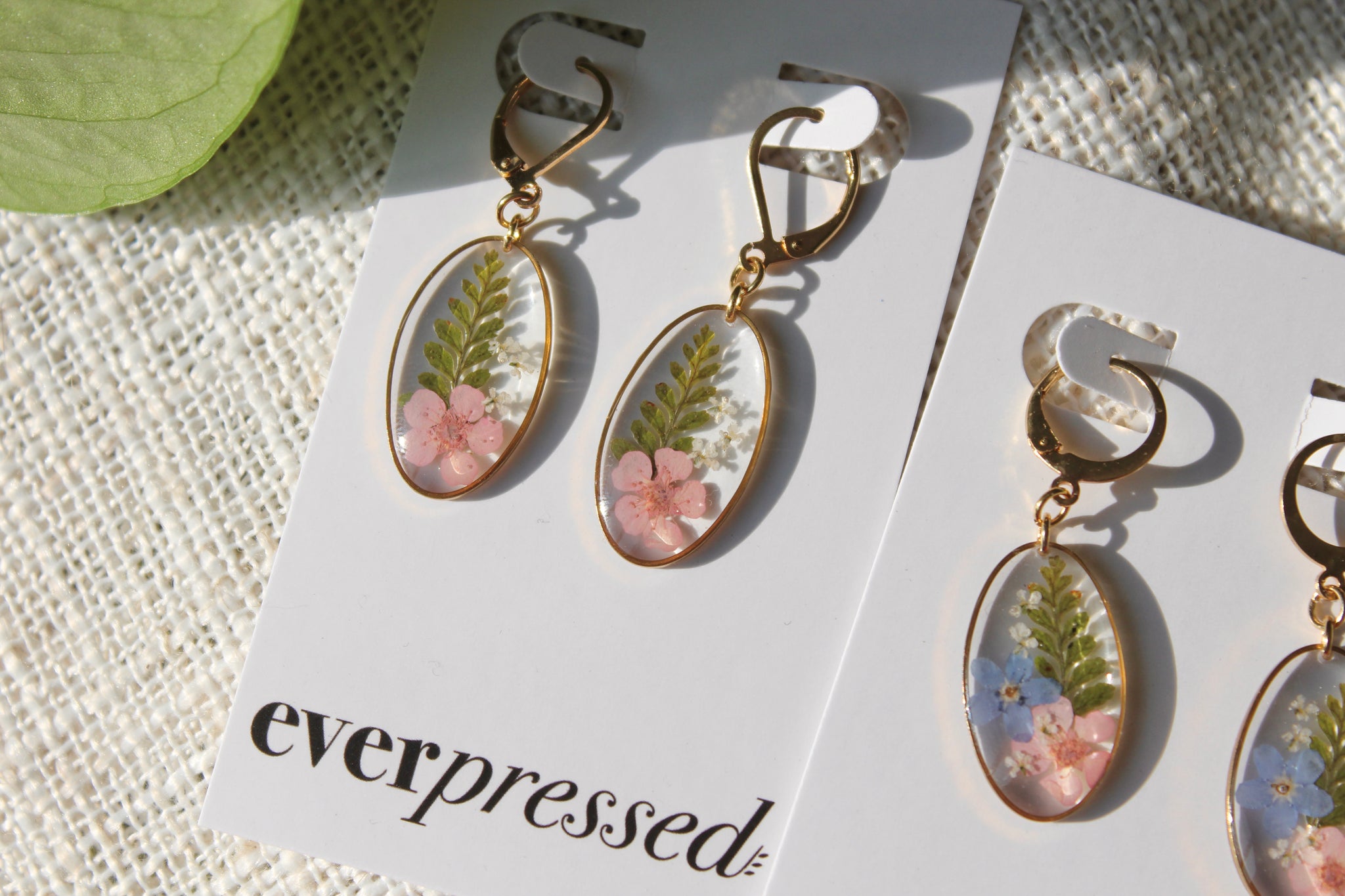 Handmade one at a time from my home studio in Alberta with real narcissus and forget me not flower and fern leaves. Inspired by the simplicity and symmetry of nature. Lightweight and perfect for everyday wear.