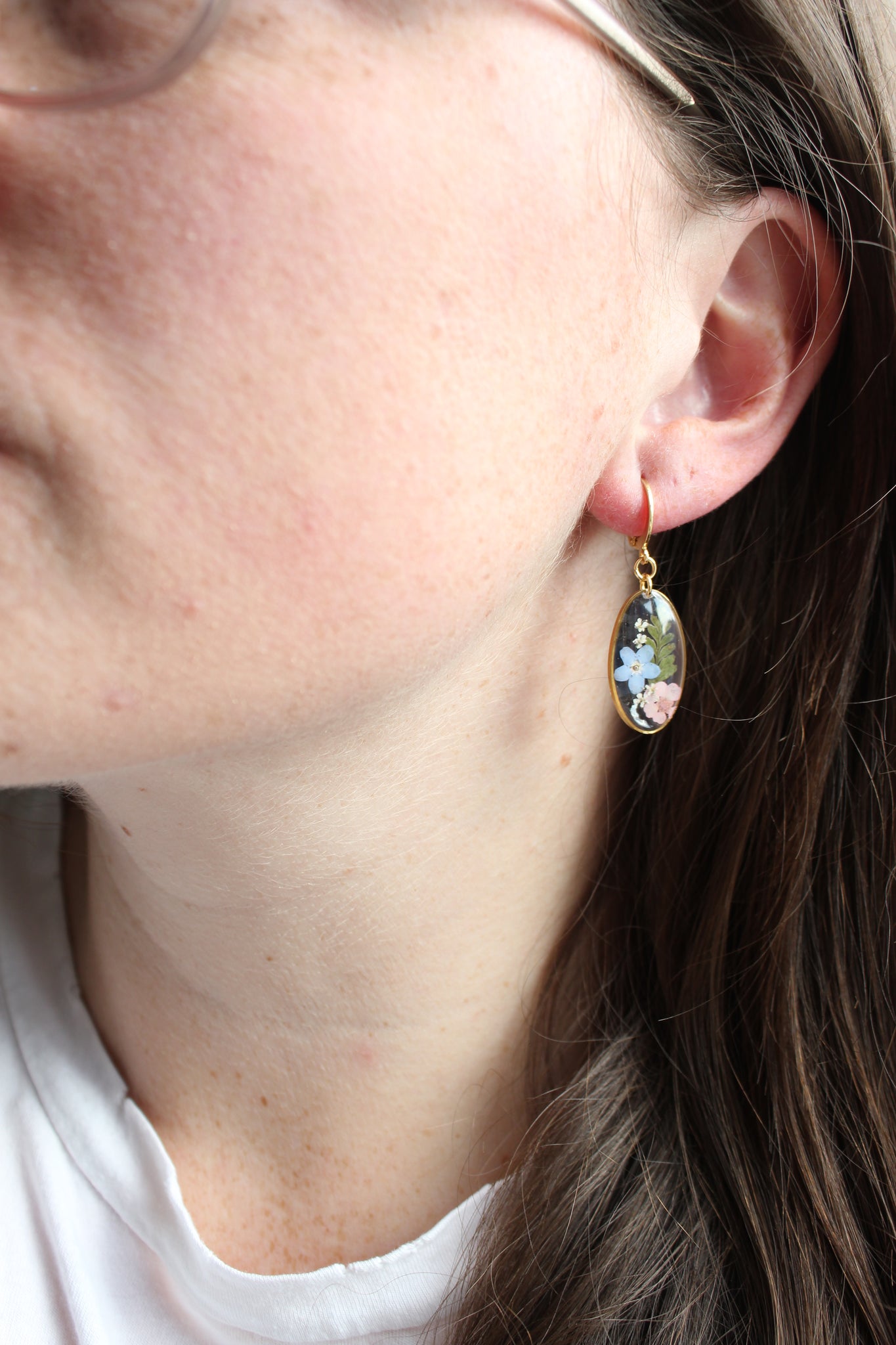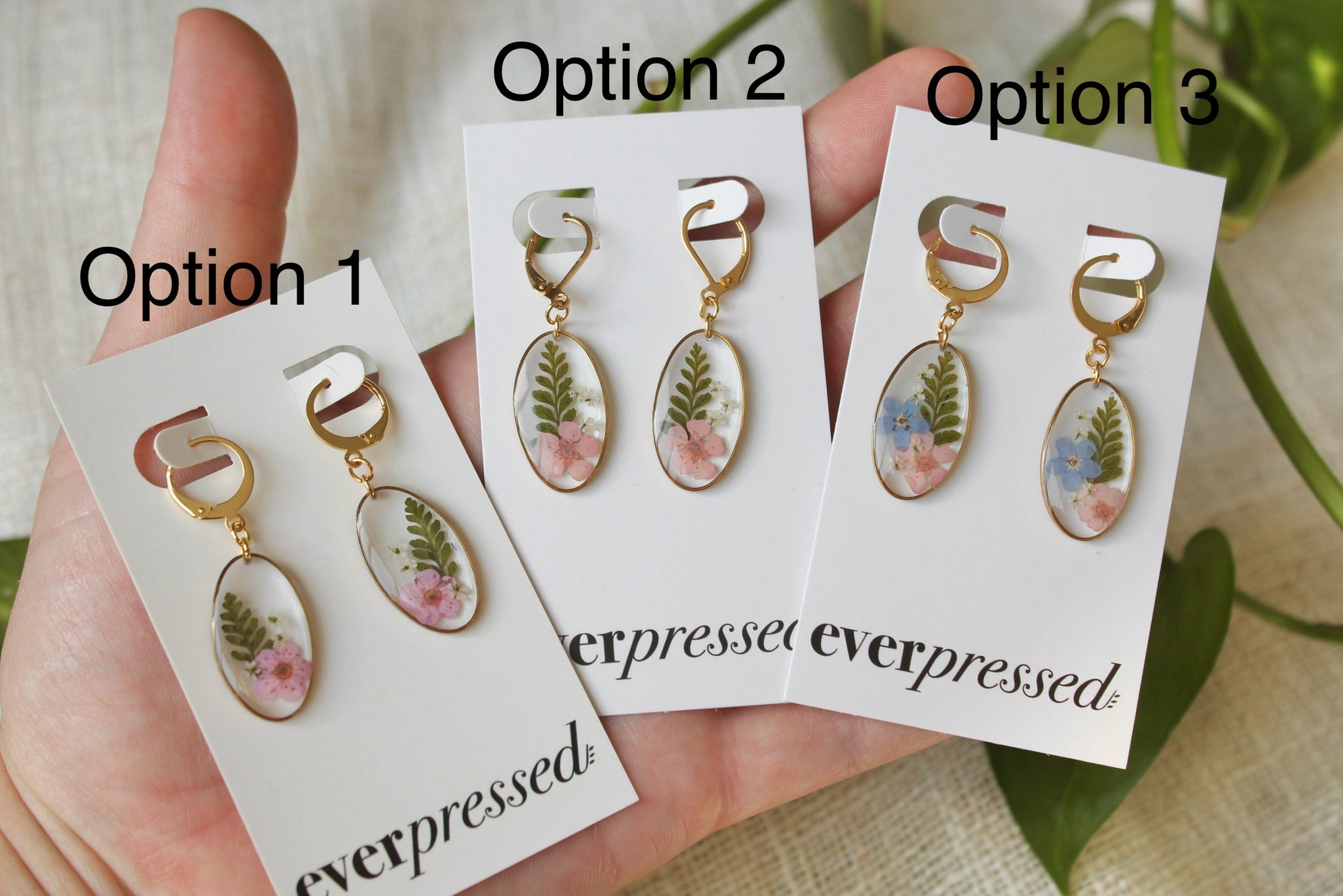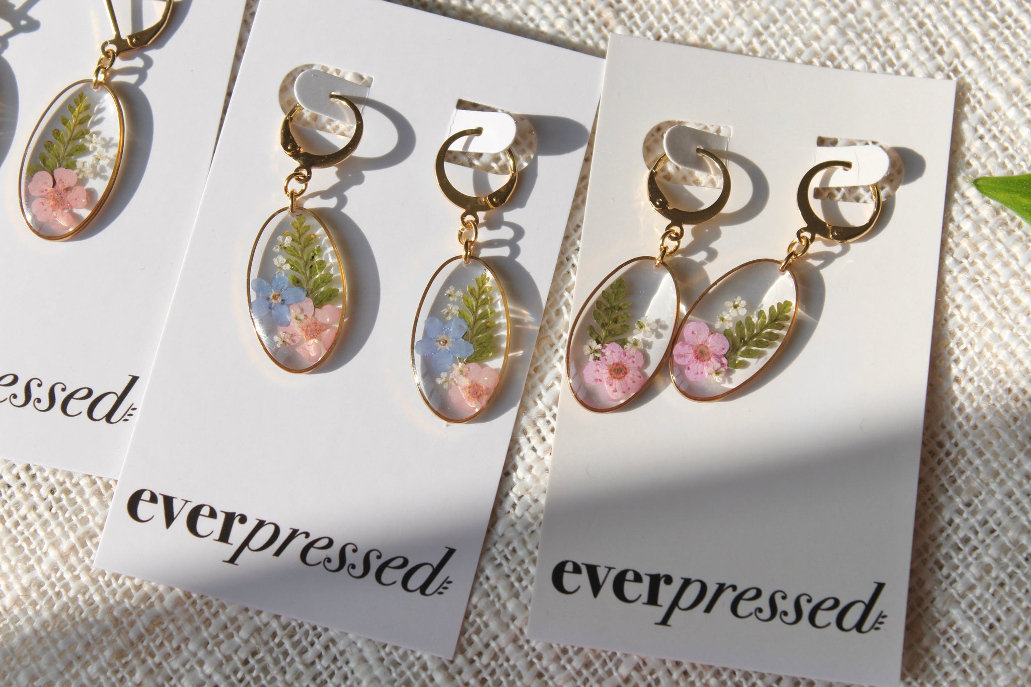 Handmade one at a time from my home studio in Alberta with real narcissus and forget me not flower and fern leaves. Inspired by the simplicity and symmetry of nature. Lightweight and perfect for everyday wear.